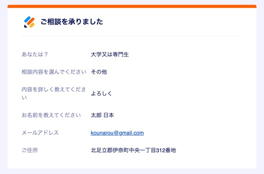 自動返信で登録内容が自動送信されます。
